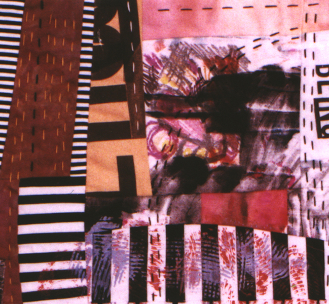 My current work integrates my life experiences as an artist. Incorporating my love of fabric and collage and my training as a painter and printmaker, I have embarked on an explorative journey in this new body of work. The subject matter of my work is deeply internalized. I often use random thoughts and symbols - sometimes interconnected, sometimes seemingly unconnected, and frequently work using a stream of consciousness thought process. Text is frequently incorporated as part of the message. Utilizing the surface techniques of monoprint, photo transfer, photocopy, silkscreen, stamping, printing and dye, paint and oil stick I am blurring the edges of quiltmaking, painting and printmaking.